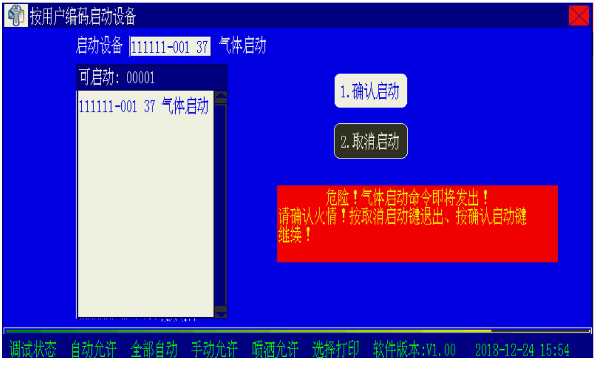 在圖2 所示界面下,選擇“取消啟動”放棄;選擇“確認啟動”控制器立即發出啟動氣體滅火設備命令!警告提示窗有時間限制,30 秒內不進行操作,放棄此次操作。